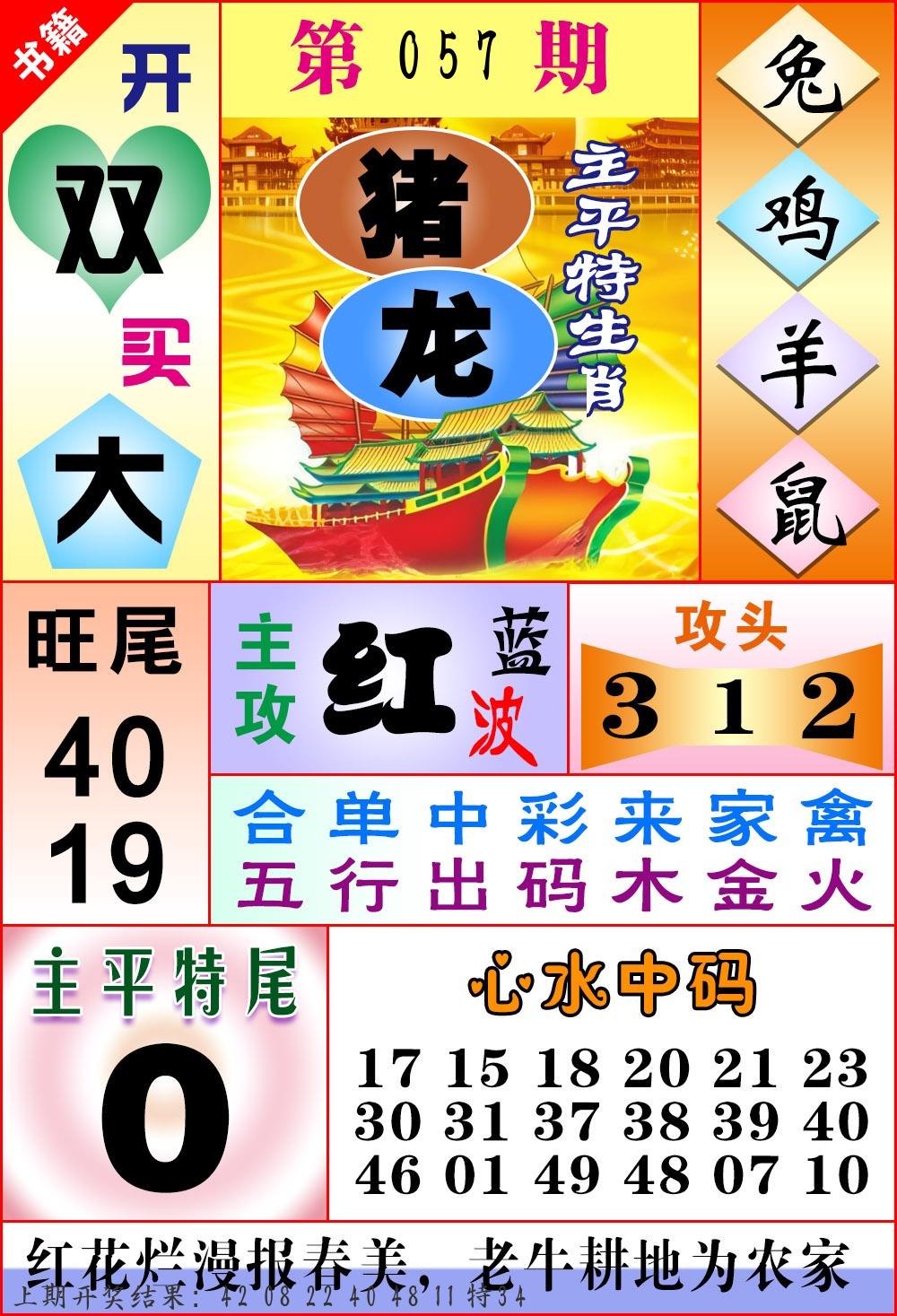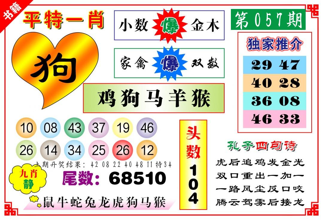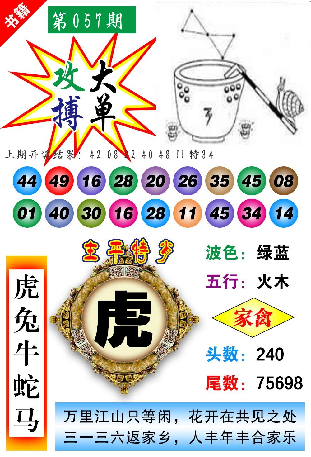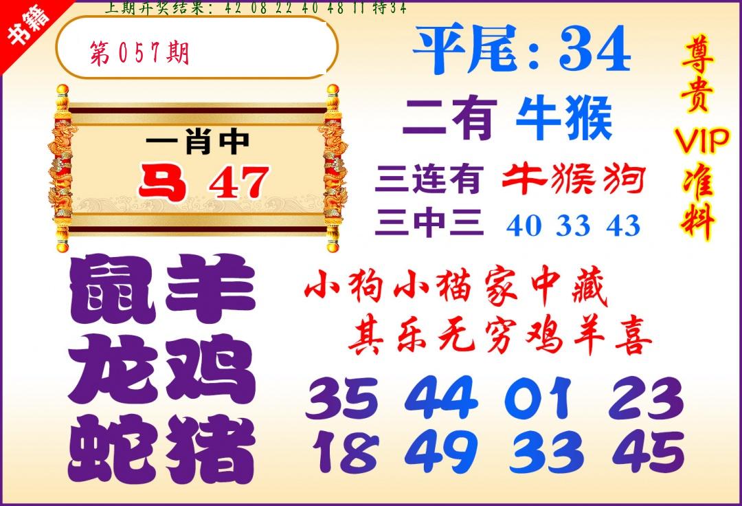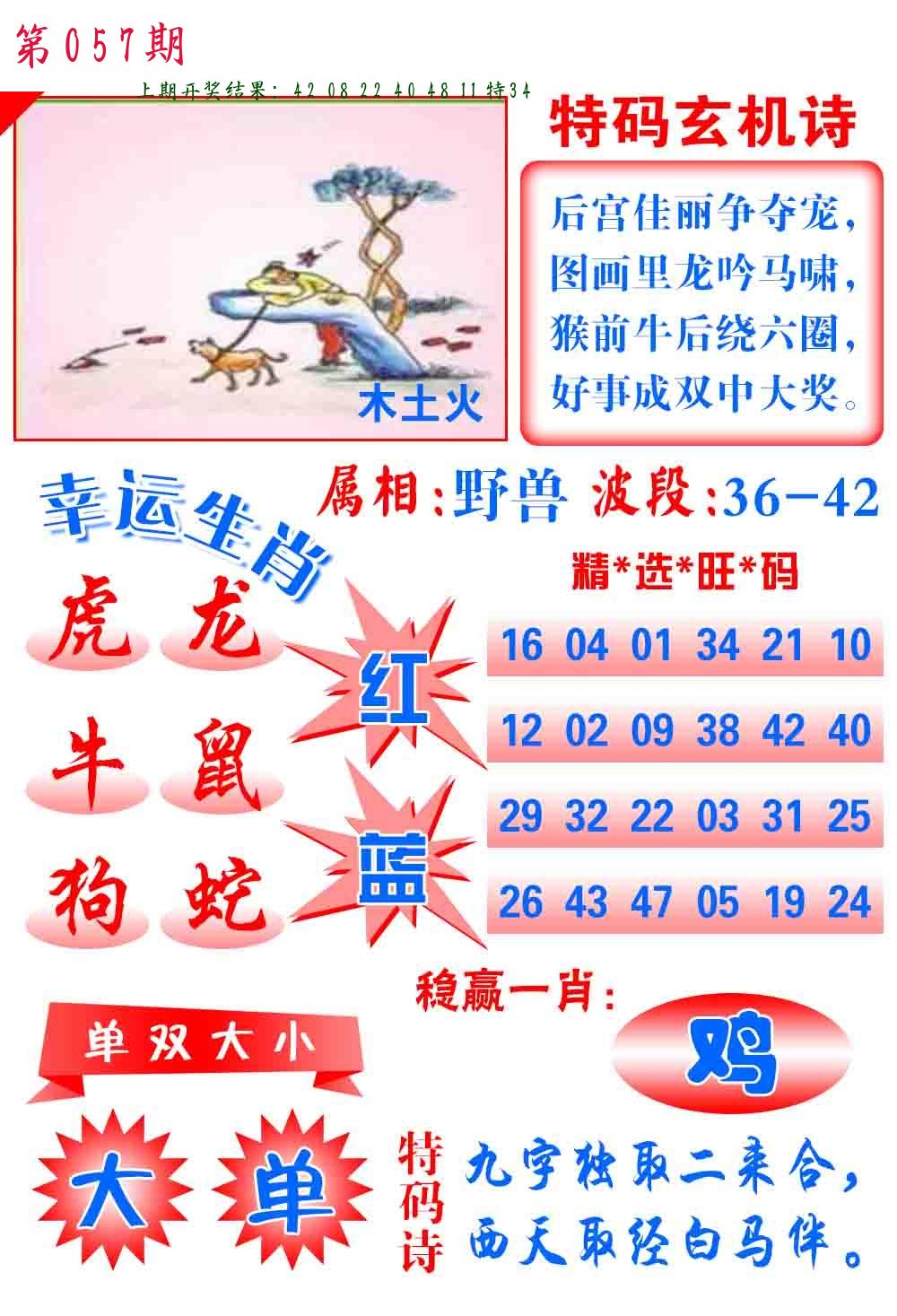 | 057期 四肖: 猪虎狗牛 | ⑤码: 32.29.22.44.17 |