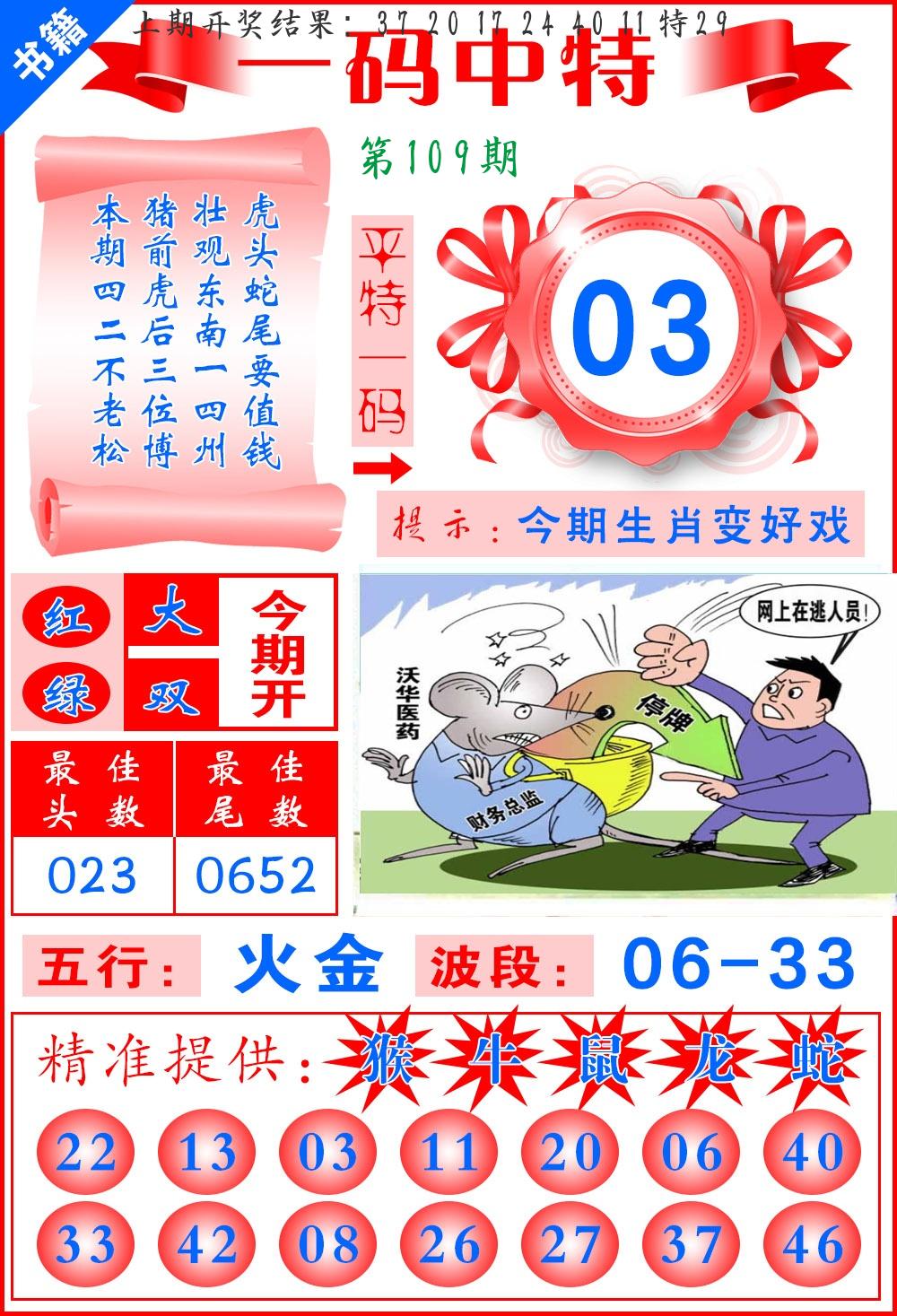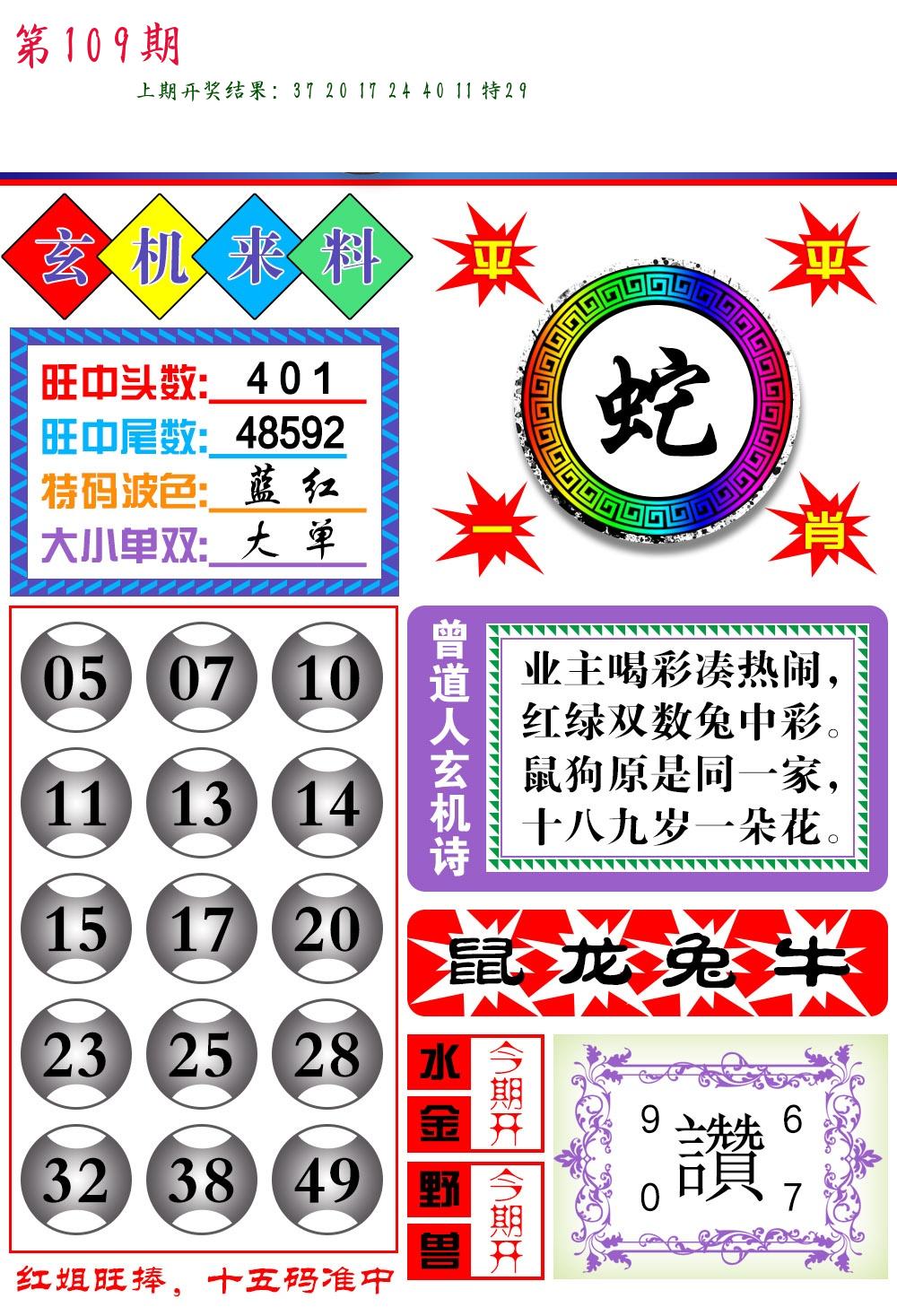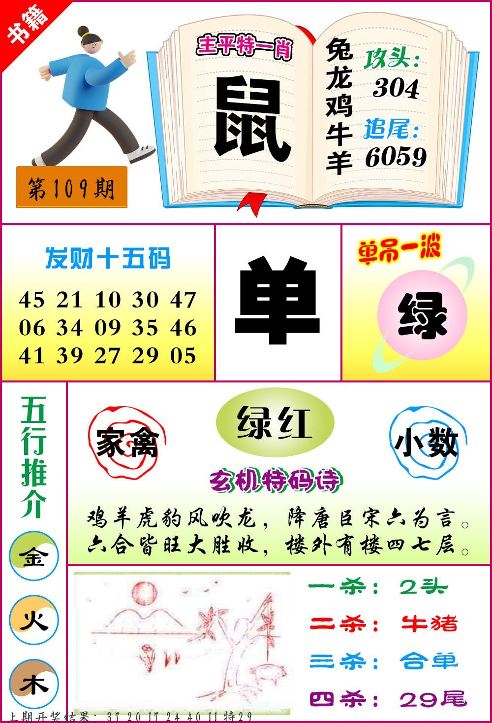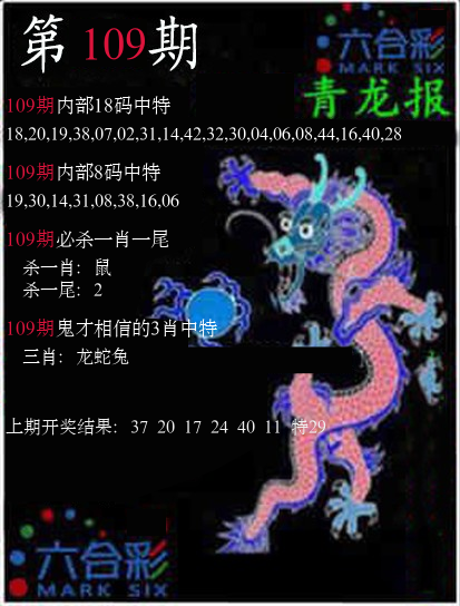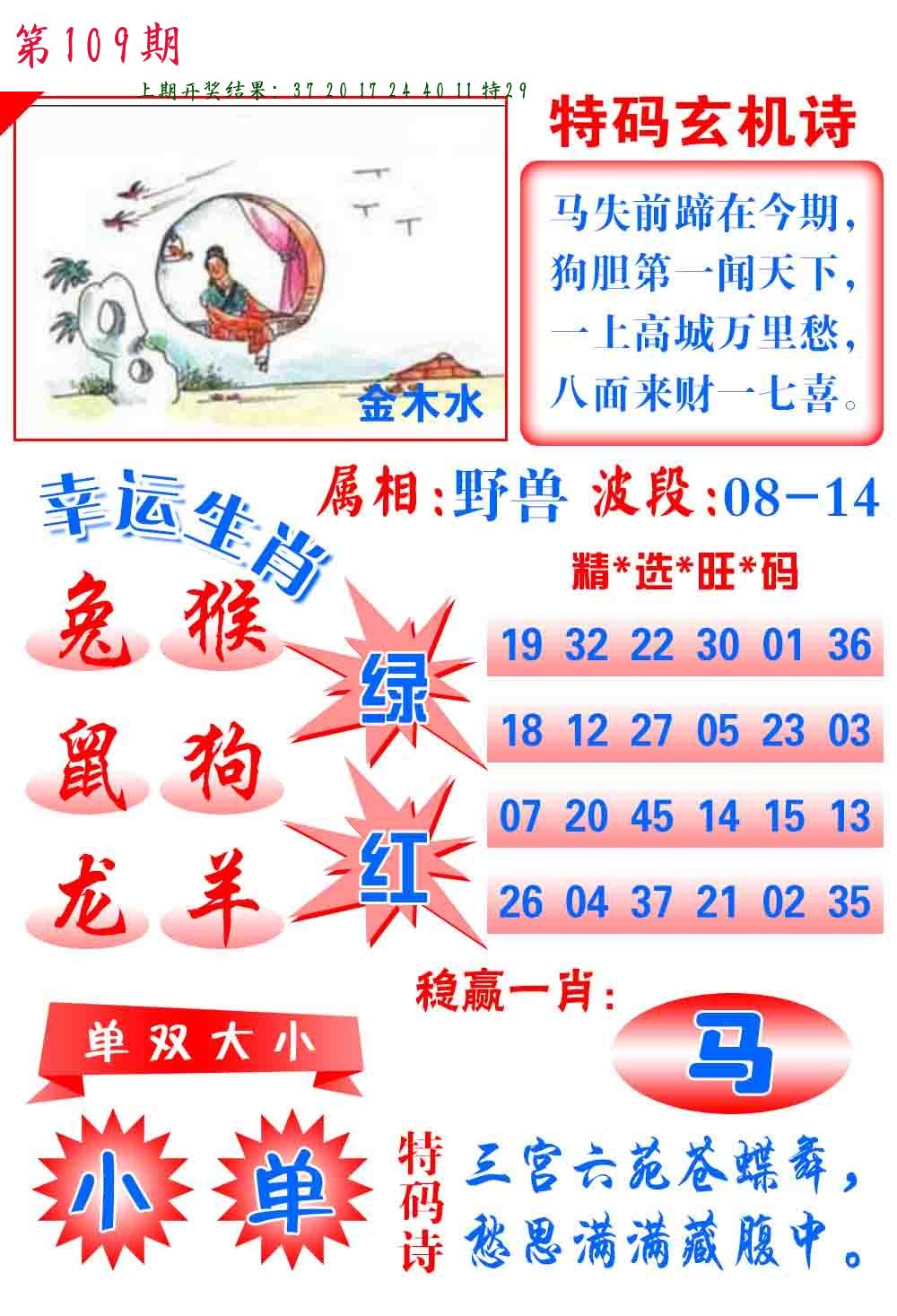 | 108期 四肖: 鼠猪鸡猴 | ⑤码: 11.20.44.26.07 |