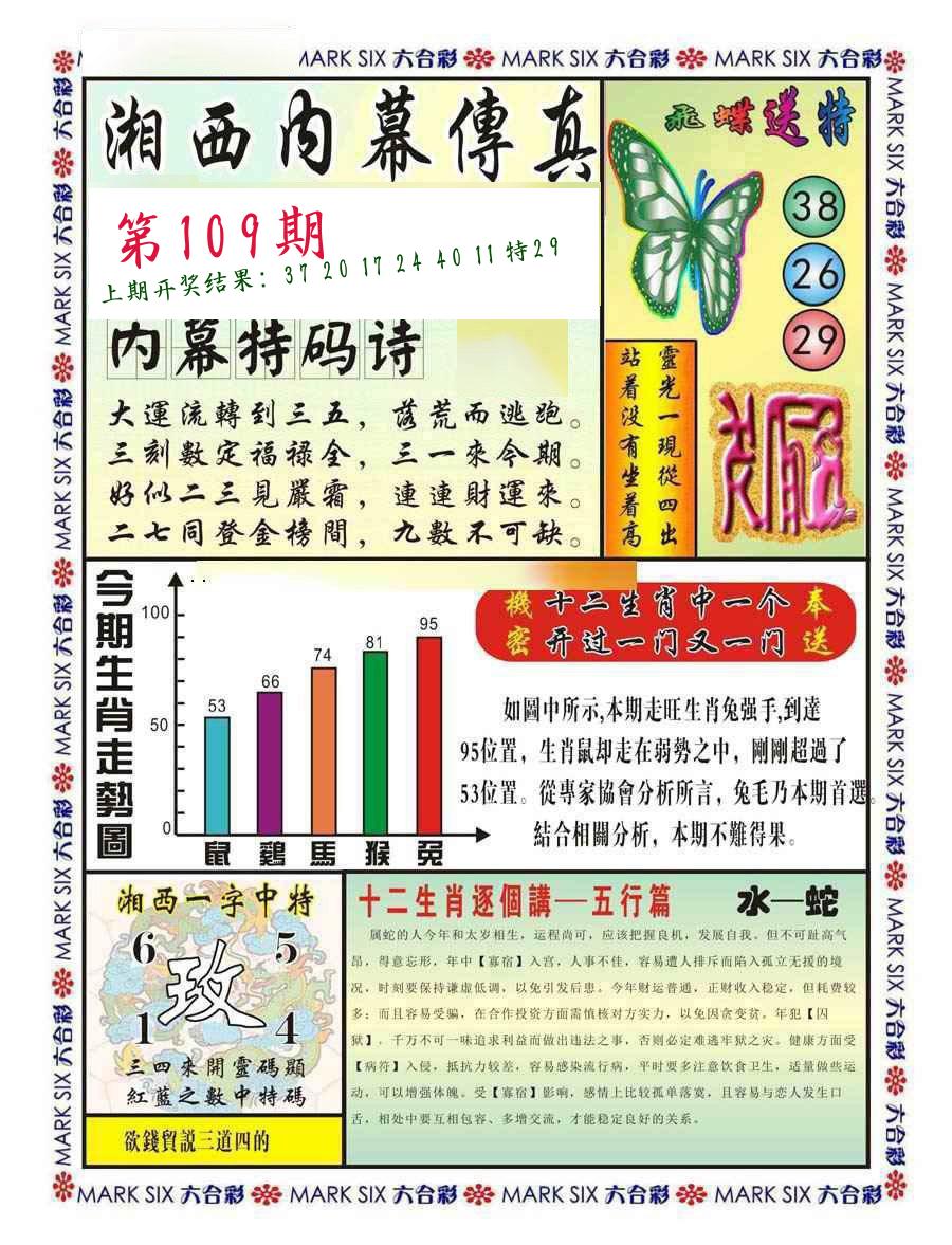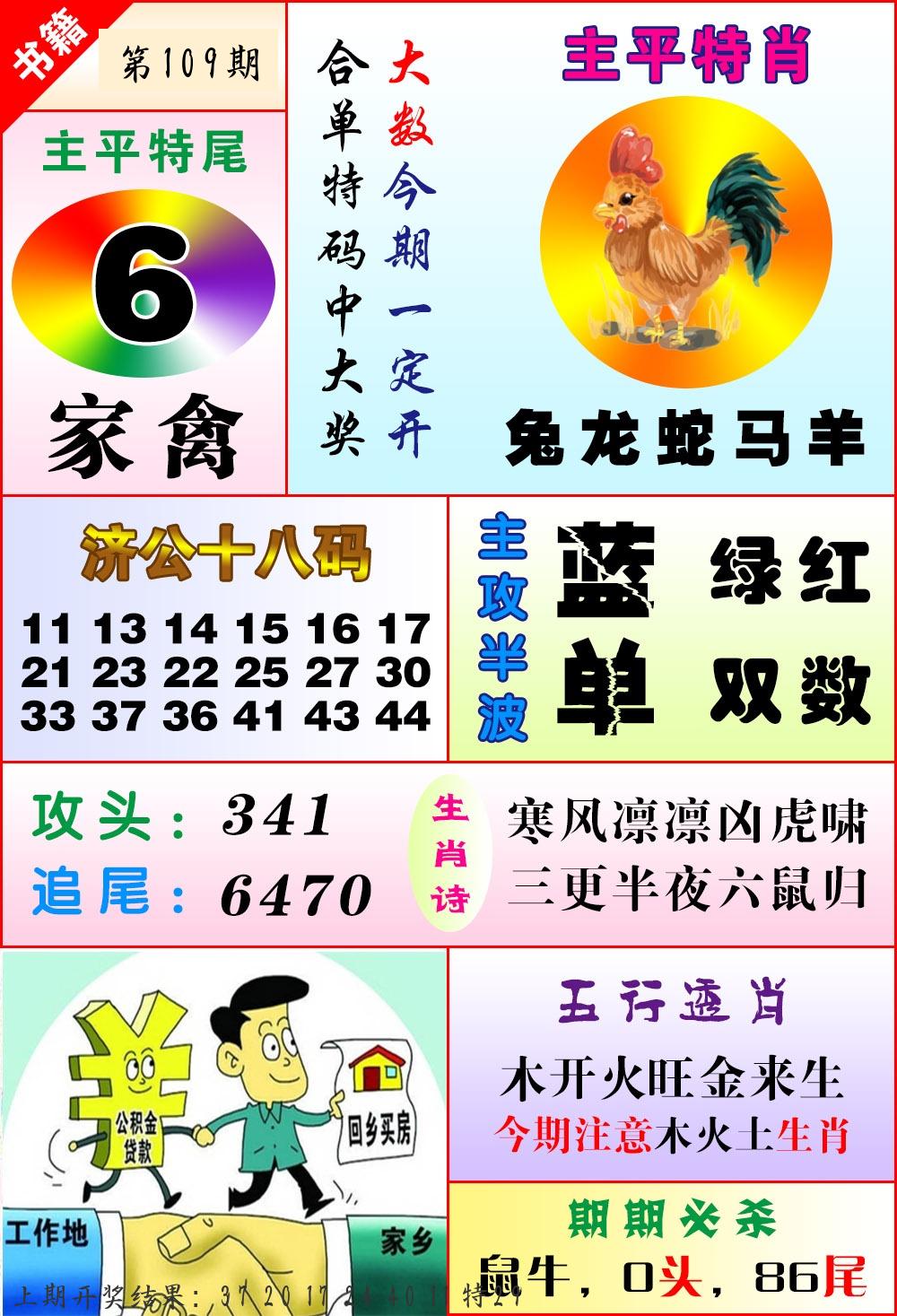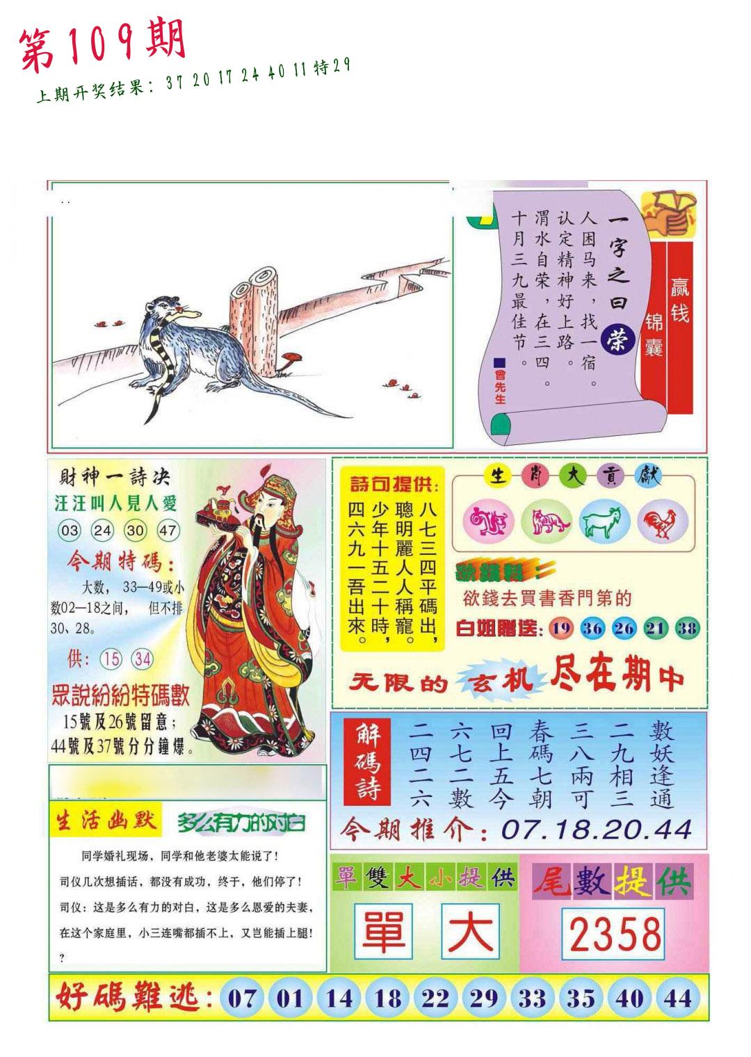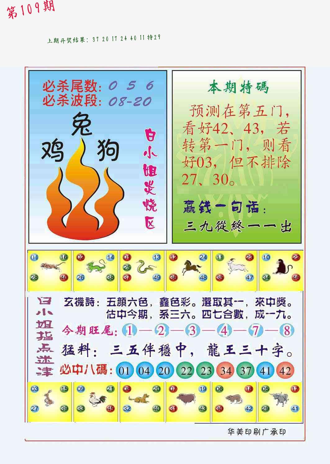| 108期 四肖: 鼠猪鸡猴 | ⑤码: 11.20.44.26.07 |