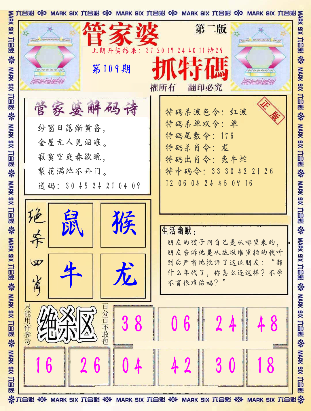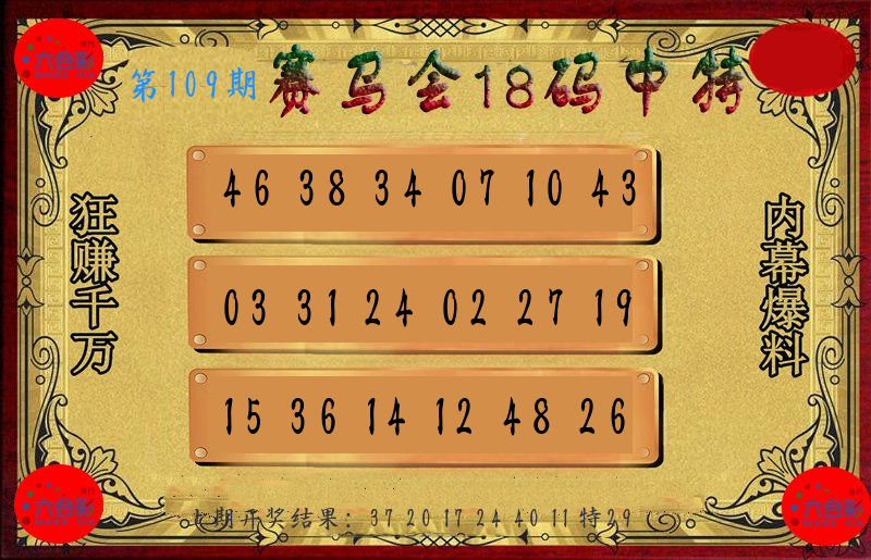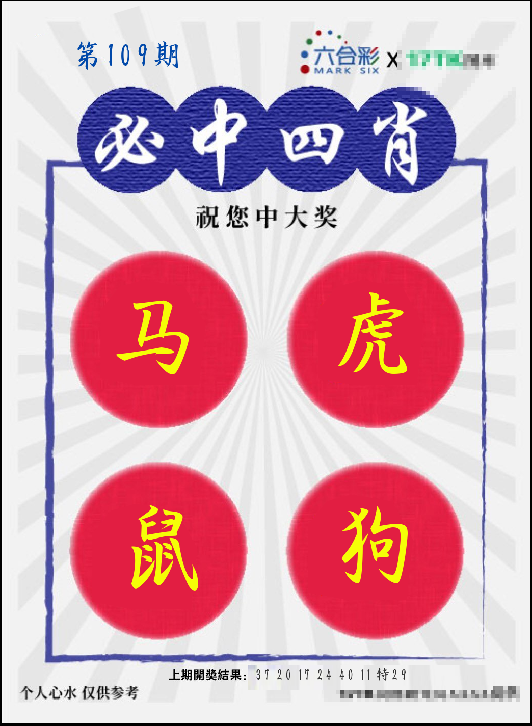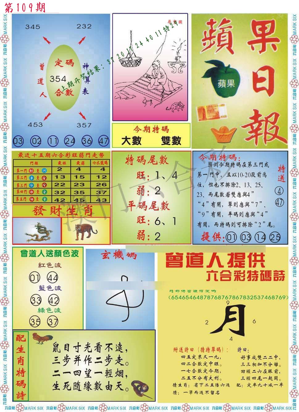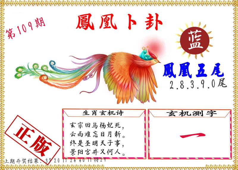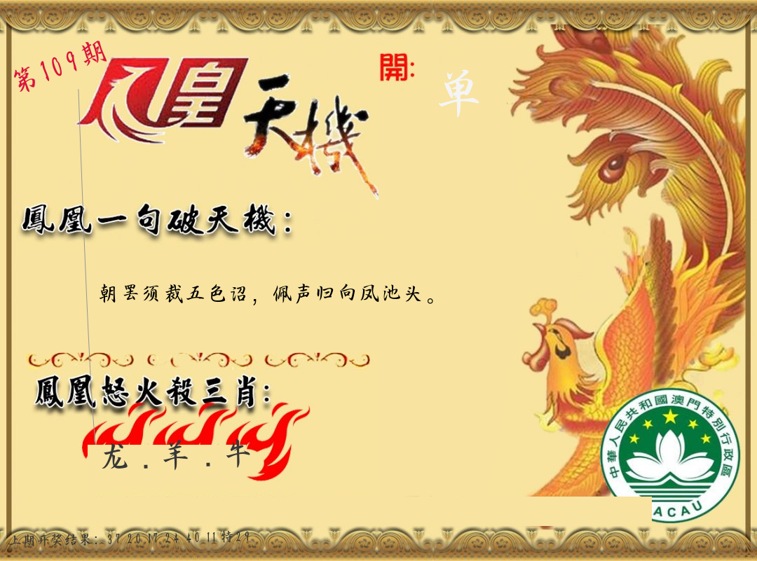 | 108期 四肖: 鼠猪鸡猴 | ⑤码: 11.20.44.26.07 |